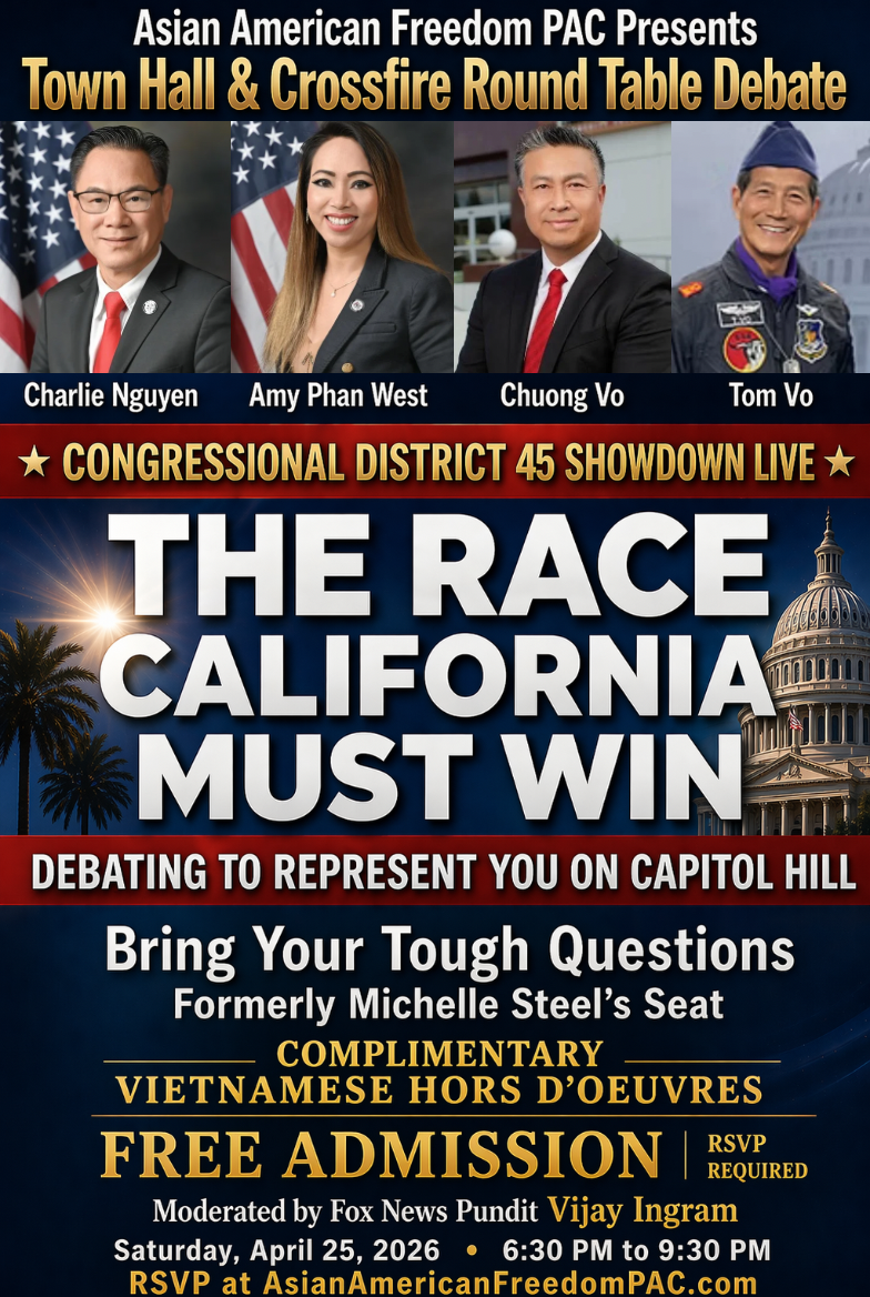 This Saturday night, April 25, at 6:30pm, the Asian American Freedom PAC is hosting an urgently important Congressional debate for District 45 in Westminster. The four Vietnamese Republican candidates are Chuong Vo, Mayor Charlie Nguyen, Amy Phan West, and Tom Vo. This is one of the most closely watched and heavily invested elections in California during the 2026 cycle! We must win back Michelle Steel's former seat!