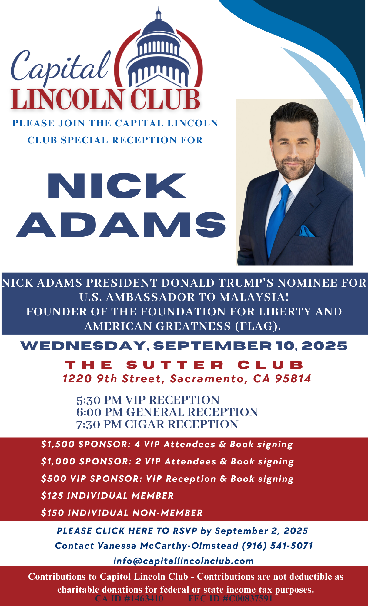 Please join the Capital Lincoln Club Special Reception for Nick Adams.