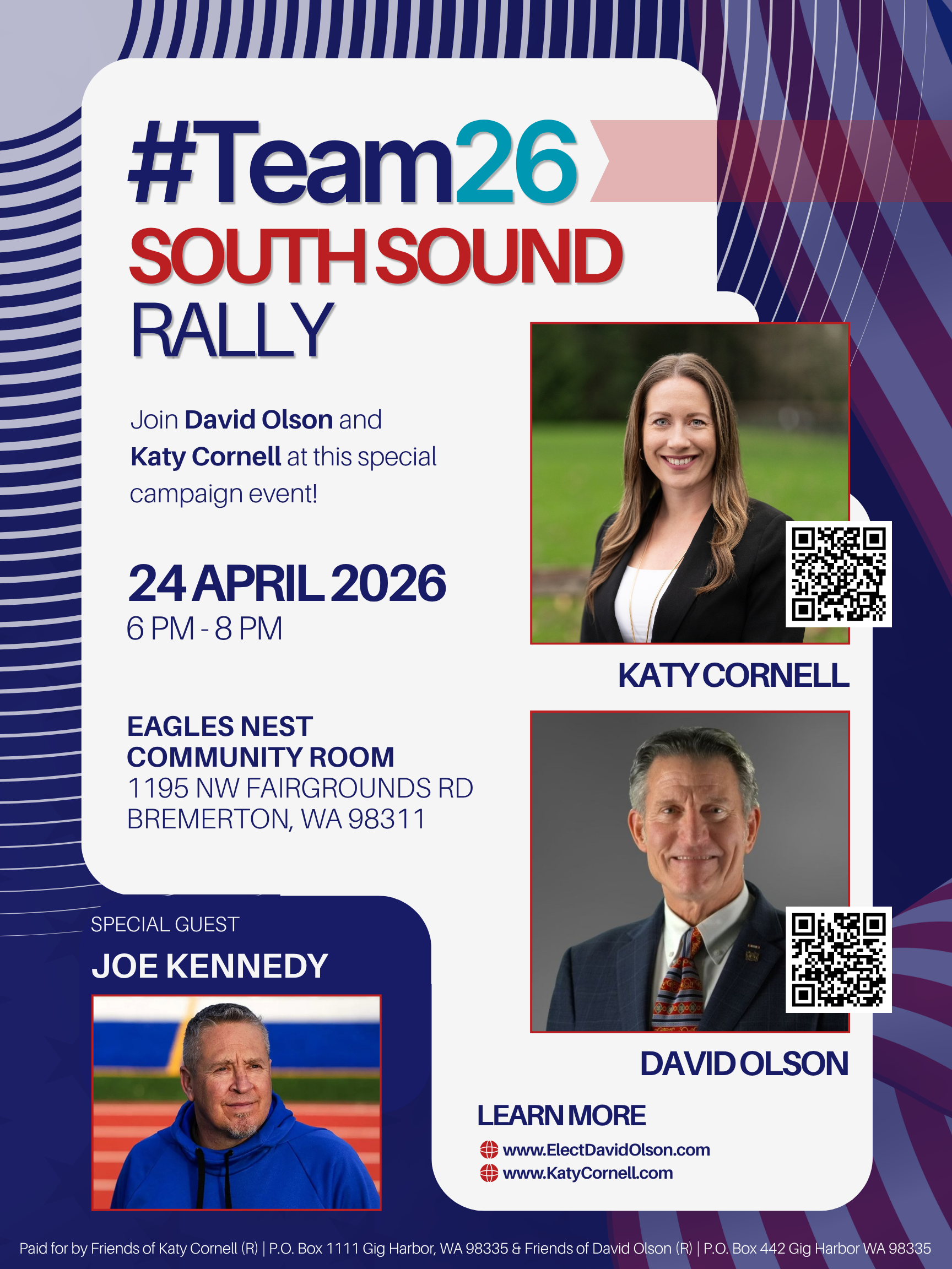 Meet David Olson and Katy Cornell as they share their vision and connect with supporters from across the South Sound. This special event will also feature guest speaker Joe Kennedy, making it a great opportunity to hear from leaders who are committed to serving our communities.