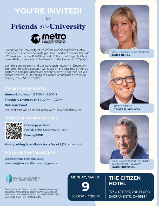 Friends of the University of California and Sacramento Metro Chamber of Commerce invite you to a Fireside Conversation with UC President James B. Milliken and UC Board of Regents Chair Janet Reilly in support of the Friends of the University 501(c)(4).