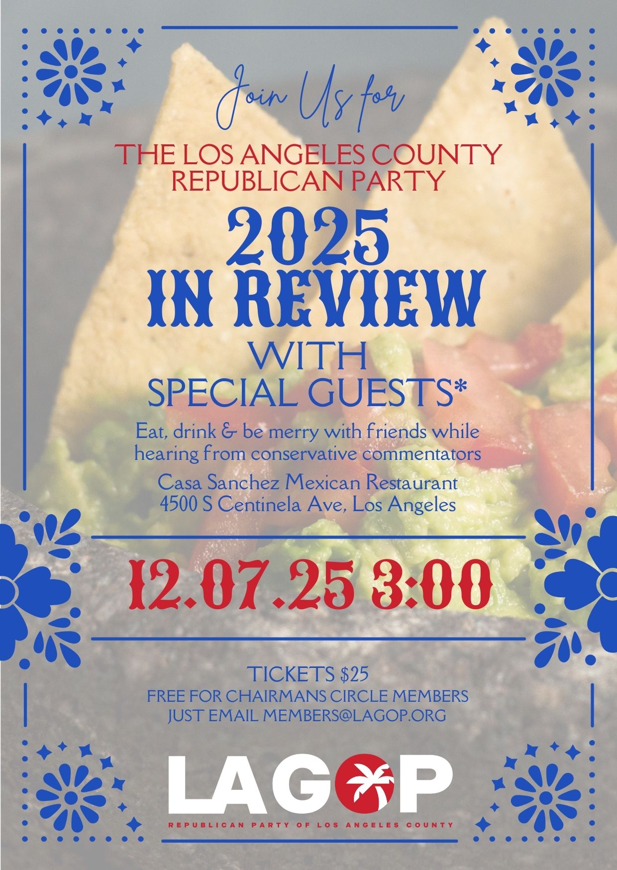 The Republican Party of Los Angeles County presents our last meeting of the year at Casa Sanchez, which specializes in fine Mexican cuisine in a welcoming venue. We will have the place all to ourselves, and our gathering will include a buffet of Casa Sanchez specialty appetizers, soft drinks and coffee, in addition to chips and guacamole. Want something a little stronger to handle our discussion of 2025 political life in Los Angeles? The cash bar will be open.