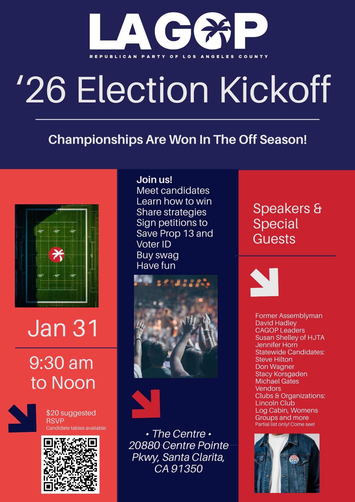 We invite you to come learn how we can move the ball down the field for Los Angeles and for California. This is an opportunity to hear directly from candidates and their teams, and from all the groups and clubs working together to bring sane, good governance to our 88 cities and our county. You’ll get a chance to sign two of the most important voter initiatives—the one to save Prop 13, championed by our friend Susan Shelley, and the one to get Voter ID on the ballot, which has wide support.
