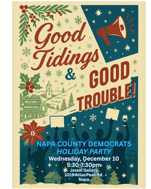 Come and celebrate our recent victories and look forward to a successful Blue new year with Napa County Democrats at a festive holiday party at Jessel Gallery in Napa. Food and drink included. Try our signature drink or Napa Valley wine! Valet Parking. $20/ticket. Go Blue!!