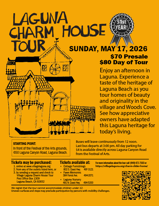 Village Laguna is a non-profit mutual benefit corporation, a civic organization dedicated to preserving and enhancing the village character of Laguna Beach. Village Laguna holds monthly meetings to hear speakers on topics of community interest, participates in city decision-making and elections, sponsors forums on major issues, and promotes activities that preserve the qualities that make Laguna Beach unique. Village Laguna welcomes new members; annual basic membership is $20 student, $40 individual, and $60 family.