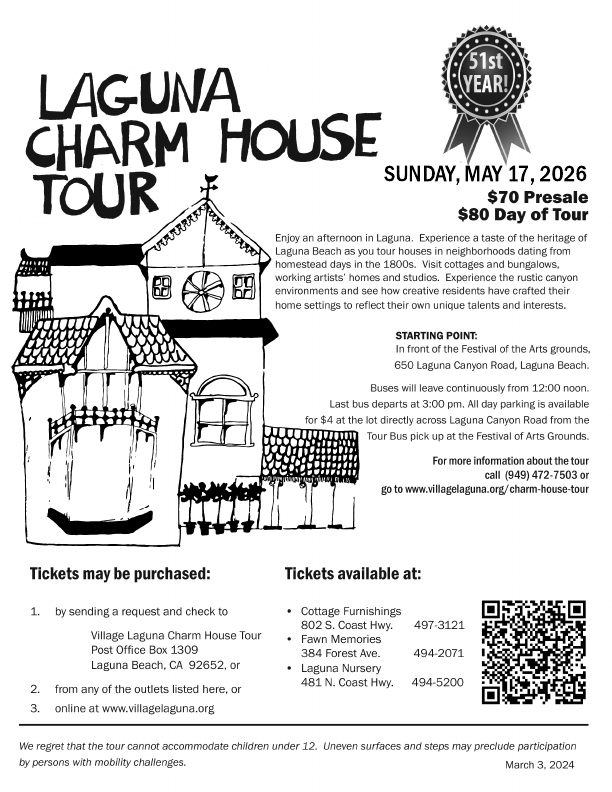 Village Laguna is a non-profit mutual benefit corporation, a civic organization dedicated to preserving and enhancing the village character of Laguna Beach. Village Laguna holds monthly meetings to hear speakers on topics of community interest, participates in city decision-making and elections, sponsors forums on major issues, and promotes activities that preserve the qualities that make Laguna Beach unique. Village Laguna welcomes new members; annual basic membership is $20 student, $40 individual, and $60 family.